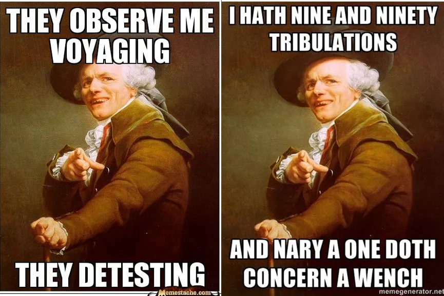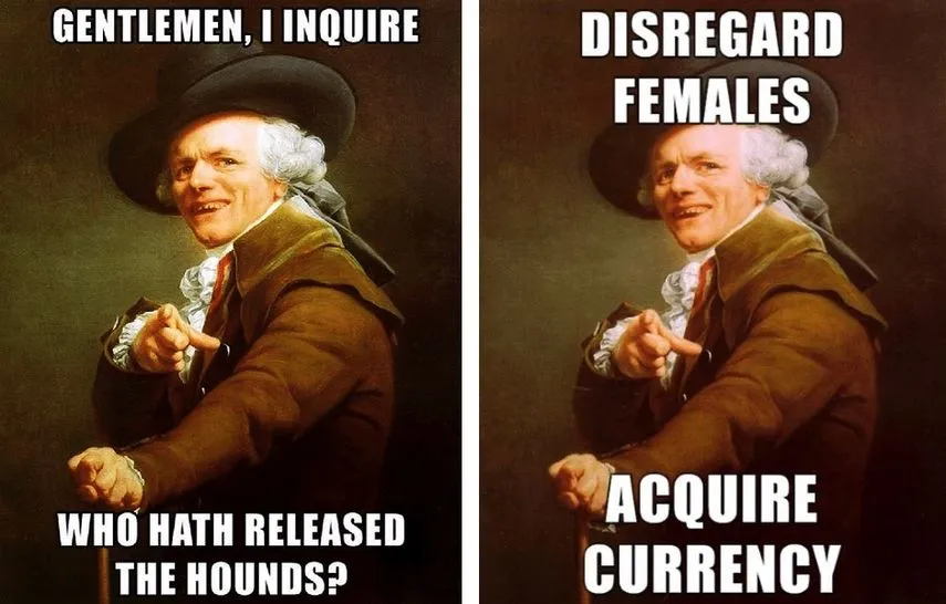 En 2009, un autor desconocido decidió crear un meme usando como base pictórica una pintura del siglo XVIII y transcribiendo letras de una canción de rap de manera más educada y menos altisonante. La melodía en cuestión era Get Money de Notorious B.I.G. de 1995, y en vez de usar el texto “F*ck bitches, get money«, lo reescribían de manera pomposa como «Disregard Females, Acquire Currency» (“Ignoren a las mujeres, adquieran divisas”). El meme empezó a ser copiado y viralizado con otras canciones como Who let the dogs out? de Baha Men –transcrita como «Gentlemen, I inquire, who hath released the hounds?” (“Caballeros, pregunto, ¿quién ha liberado los canes?”)–, y Don’t hate the playa de Ice-T –que en vez de utilizar “Don’t hate the player, hate the game” trascribía la letra como “Do not despise the racketeer, instead, despise his sport» (“No desprecies al timador, mejor desestima su deporte”)–. Su popularidad se basó tanto en la comicidad de lo rimbombante y dominguero del texto como por el reto de descubrir la canción referida.