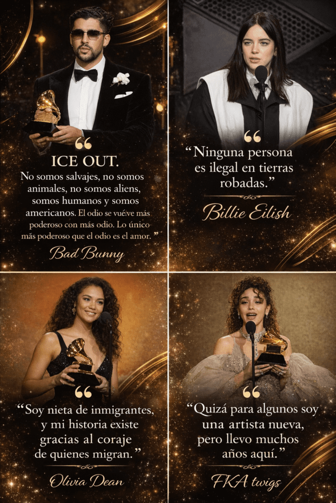 Uno de los hechos más relevantes de la noche fue el reconocimiento a producciones y artistas que representan una industria cada vez más plural. El premio a Álbum del Año marcó un precedente histórico al recaer en una obra completamente en español, un hecho que rompe con décadas de predominio del inglés en las categorías principales y que confirma la expansión del mercado musical hacia audiencias globales más amplias.